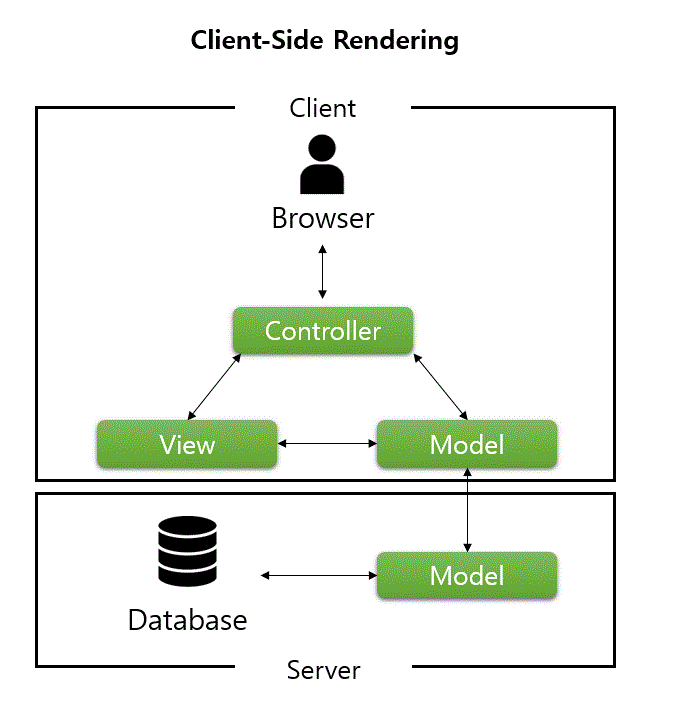 - 반면 CSR의 경우 서버에서 View를 렌더링하지 않고, HTML, JS파일, 각종 리소스를 다운로드 받은 후 브라우저에서 렌더링을 하기 때문에 SSR보다 초기 View 로딩 속도는 느리다.