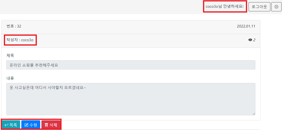 - 내가 작성한 글만 수정, 삭제 가능하게 하기