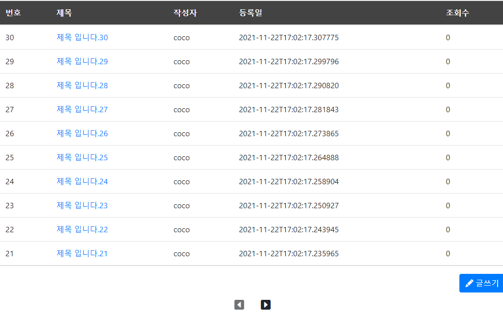 게시글은 총 30개이고, page 1당 10개씩 총 3개의 page(0, 1, 2)가 끝이어야 하는데,