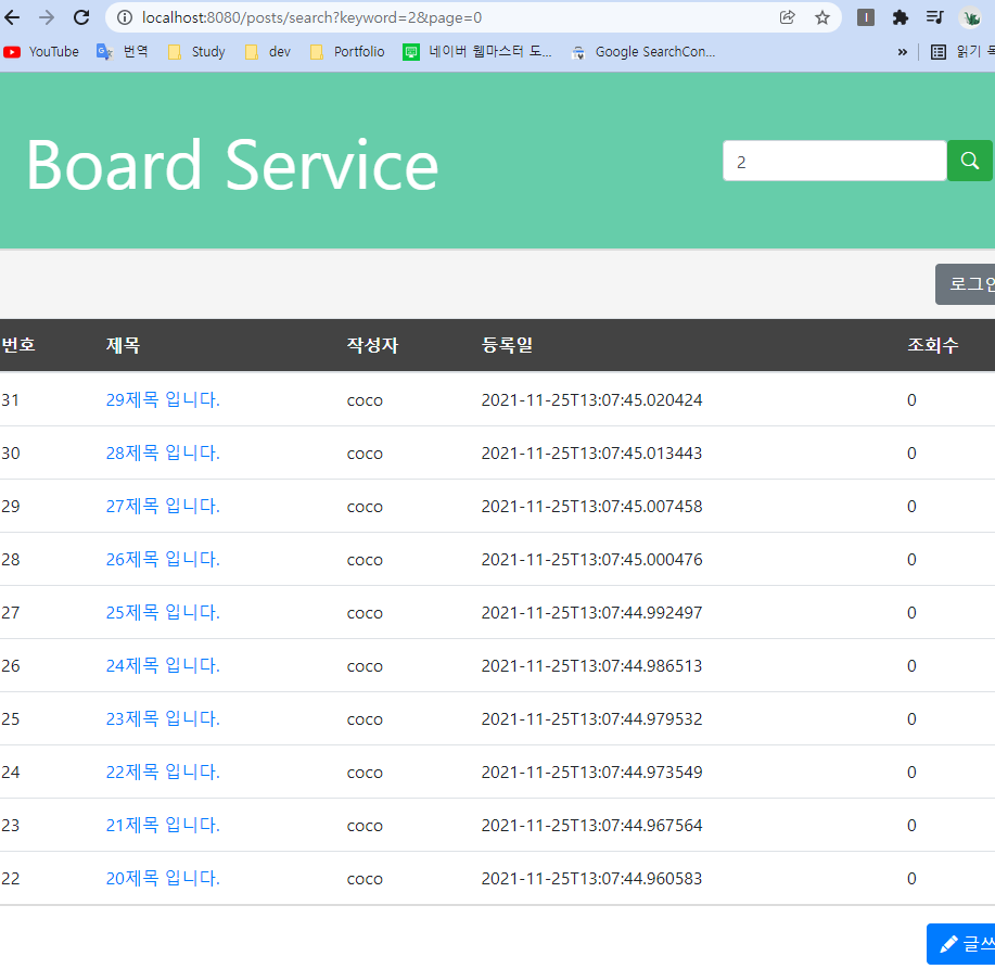 '2' 를 검색했더니 페이지 사이즈가 10으로, 그리고 DESC 정렬되어있는 것을 확인할 수 있다.