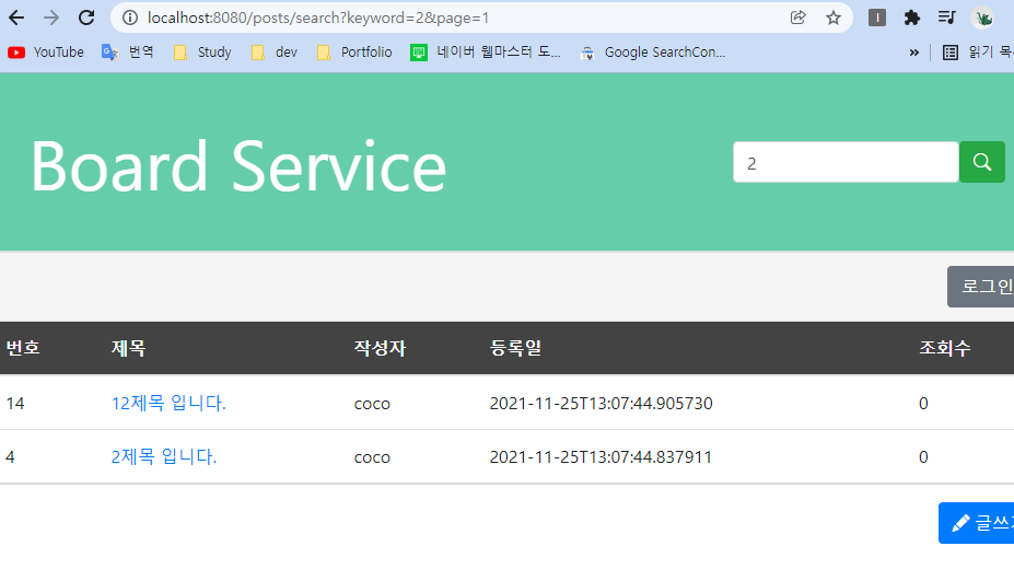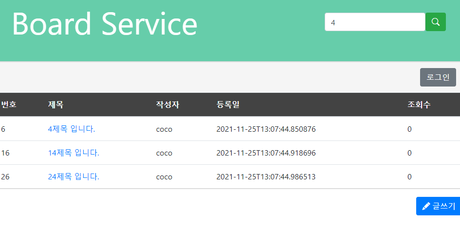'4'를 검색했을 때 제목에 4가 포함된 글들을 가져오는 걸 확인할 수 있다.