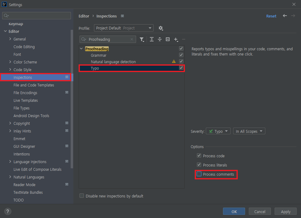 3. [ Proofreading > Typo > Process comments 체크 해제 ]