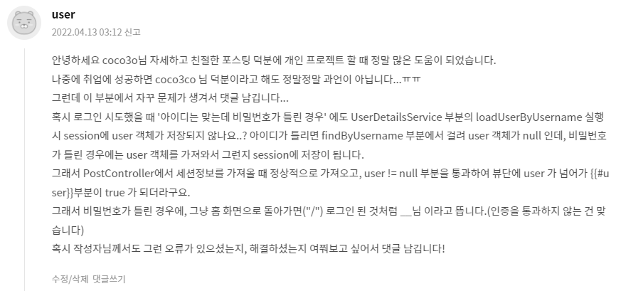 - 만약 로그인 페이지 상태에서 잘못된 로그인 정보를 입력한다고 치면, 로그인에 실패했지만 아무런 에러 메시지를 보지 못하고 로그인 페이지만 보일 것이다. 로그인이 실패했으면 어떤 이유로 실패했는지 에러 메시지를 띄워주어야 한다고 생각한다.그래서, AuthenticationFailureHandler를 구현했지만, SPRING_SECURITY_LAST_EXCEPTION의 키값을 머스테치에 어떻게 넘겨줘야 될지 모르겠다..