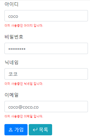 errors.rejectValue("username", "아이디 중복 오류", "이미 사용중인 아이디 입니다.");
