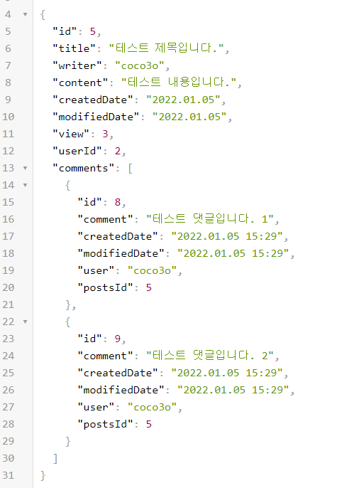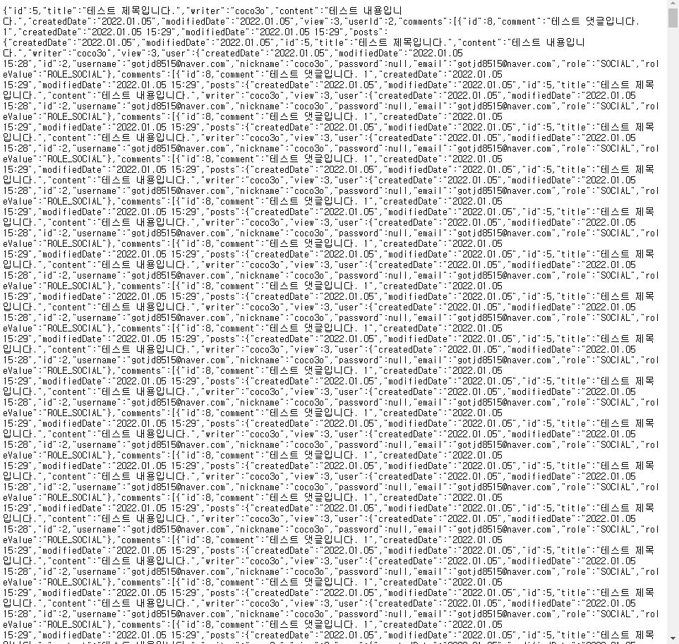 이 또한 JPA가 서버에서 클라이언트로 Comment의 정보를 보내줄 때 Posts 정보도 같이 보내주게 된다.