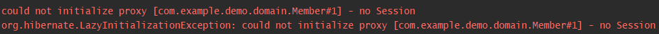 하지만, 지연 로딩(LAZY) 적용 상태에서 Board의 Member를 접근하려 하면 다음과 같은 오류가 발생한다.