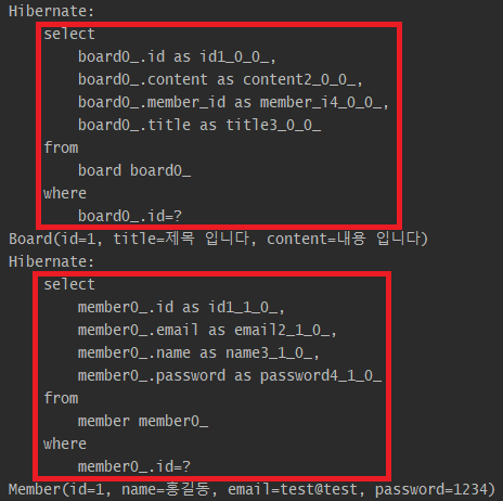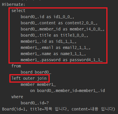 실행된 SQL 쿼리문을 보면 board 테이블 외에 member 테이블도 함께 조회하며, outer join으로 처리되는 것을 볼 수 있다.
