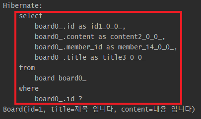 Board 엔티티에 지연 로딩을 적용하고 SQL 쿼리문을 확인해보면 이전과는 다르게 Board 테이블만 조회된다.