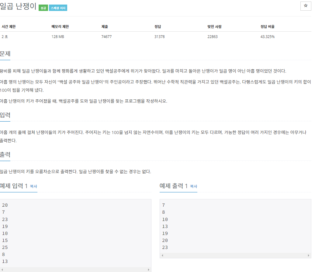 아홉 개의 줄에 걸쳐 난쟁이들의 키가 주어진다. 주어지는 키는 100을 넘지 않는 자연수이며, 아홉 난쟁이의 키는 모두 다르며, 가능한 정답이 여러 가지인 경우에는 아무거나 출력한다.