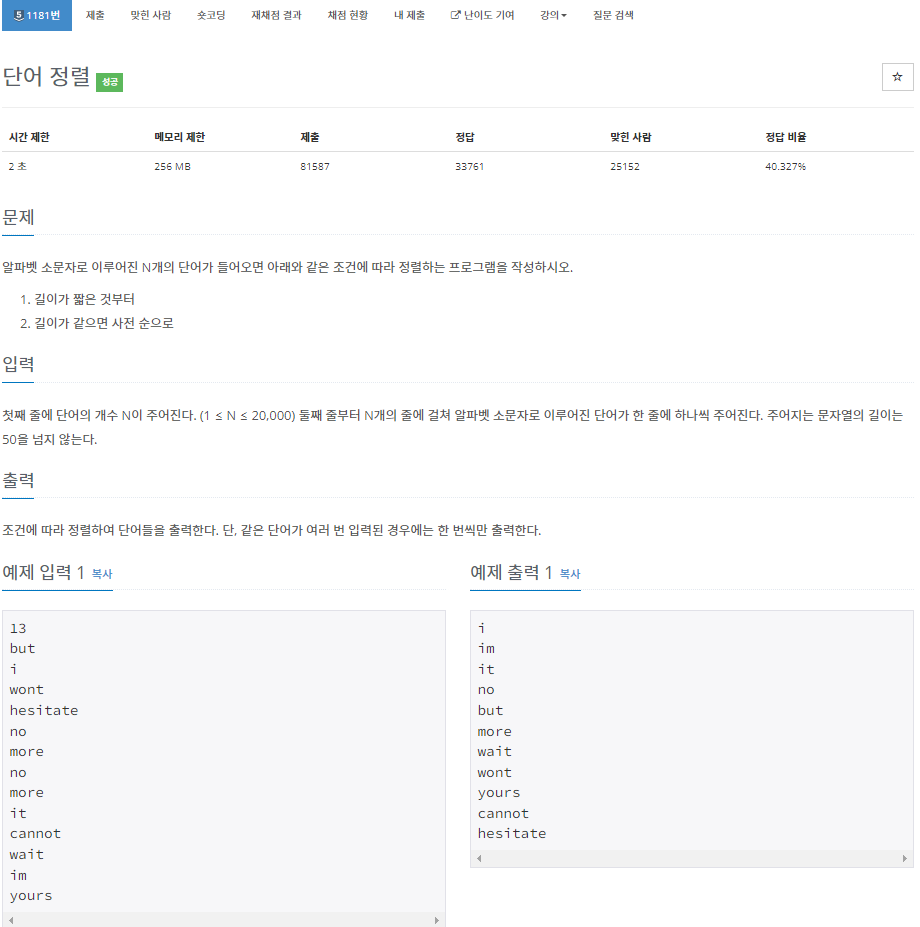 Comparator를 구현하여 단어의 길이가 같을 경우 사전순으로 정렬하고, 그 외에는 단어 길이순으로 정렬해준다.