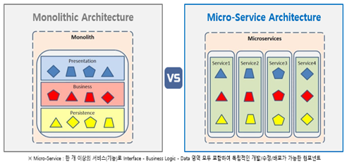 모든 시스템의 구성요소가 한 프로젝트에 통합되어 있는 Monolithic Architecture(모놀리식 아키텍쳐)의 한계점을 극복하고자 등장하게 되었습니다.