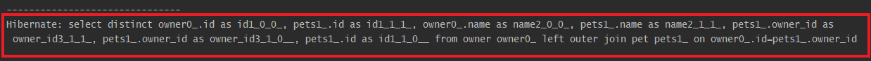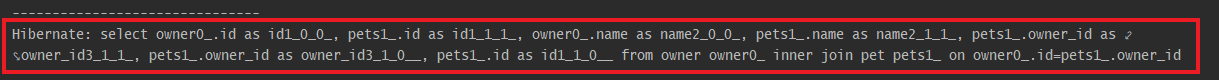 결과를 보면 쿼리가 1번만 발생하고 미리 owner와 pet 데이터를 조인해서 가져오는 것을 볼 수 있다.