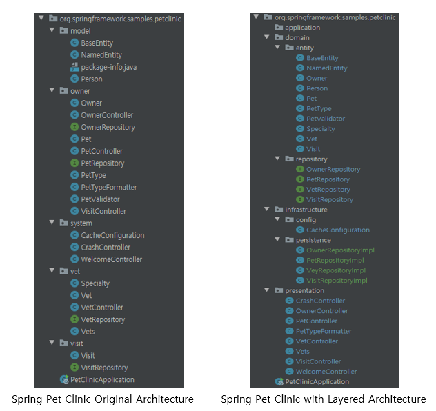 Spring의 대표적인 예제 프로젝트인 Spring Pet Clinic으로 Layered Architecture를 패키지로 구성해보면 다음과 같다.