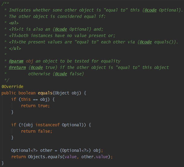 기본적인 참조 확인과 타입 확인 이후에 두 Optional 의 동치성은 내부 값의 equals 구현이 결정한다.