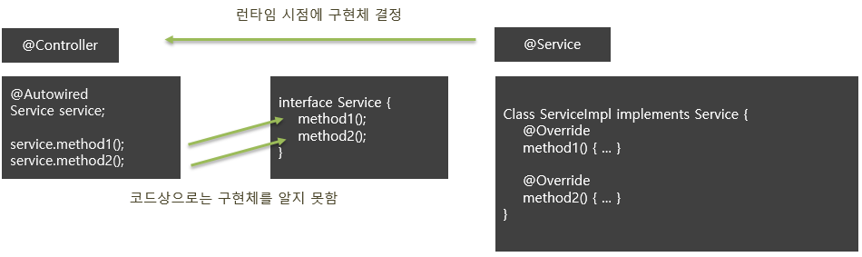 즉, 구현체가 런타임 시점에 지정되므로 컨트롤러는 실제 구현 클래스가 누군지 런타임 시점까지 알지 못하며, 컨트롤러와 서비스는 느슨한 결합도를 가지게 된다.