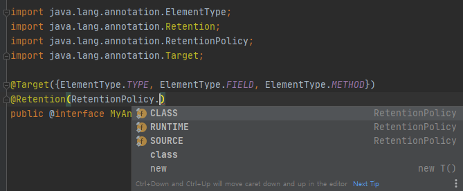 보통 어노테이션은 Runtime시에 많이 사용하므로 대부분의 어노테이션의 Retention 값은 RUNTIME으로 되어있다.