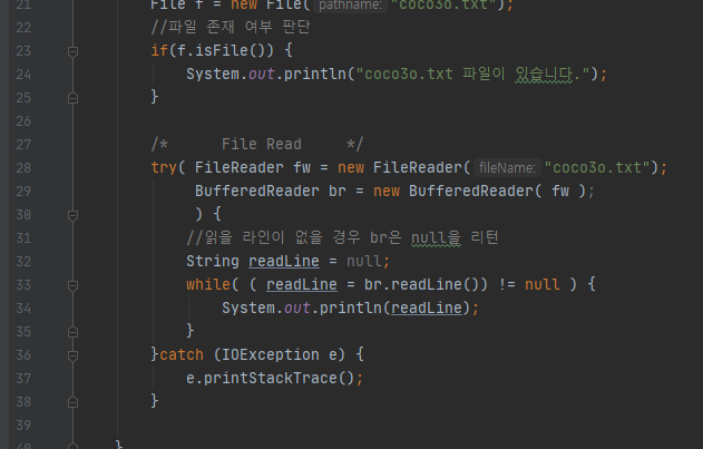 아래처럼 콘솔창에 "coco3o.txt 파일이 있습니다" 문자열이 출력된다.