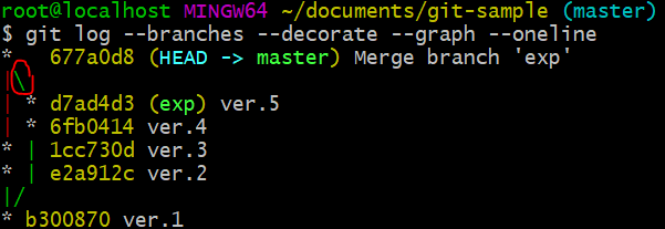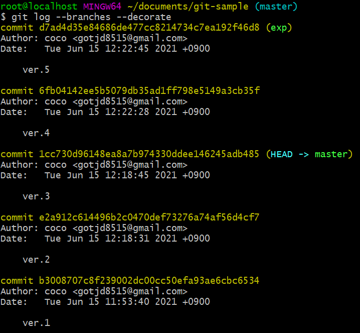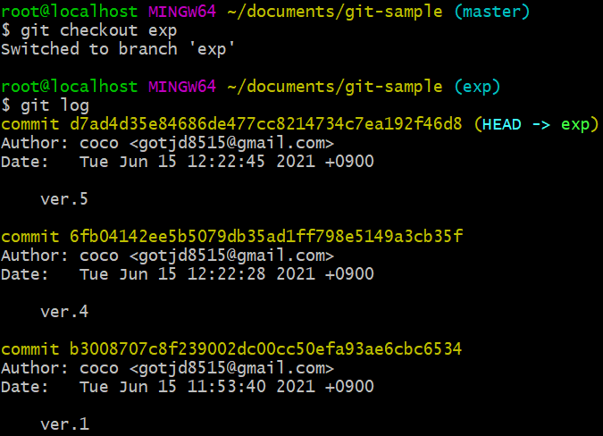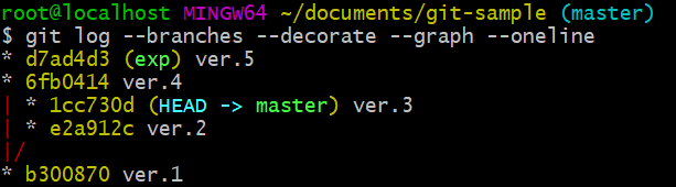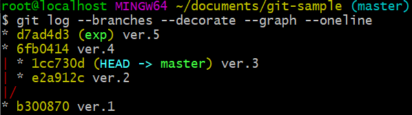 master 브랜치는 ver.1, ver.2, ver.3를, exp 브랜치는 ver.1, ver.4, ver.5에 해당하는 히스토리 정보를 저장하고 있다.