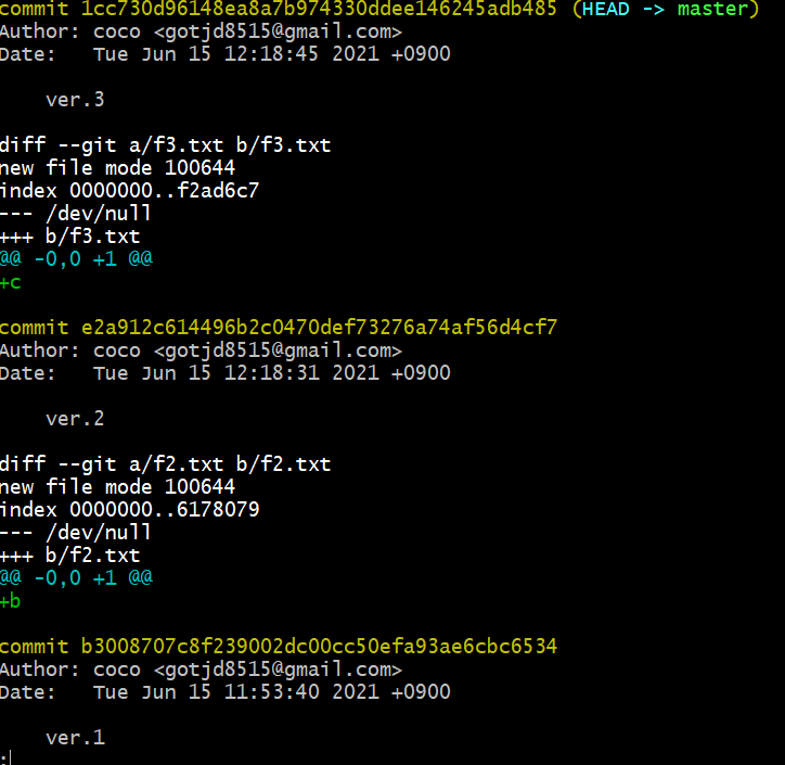 위와 같이 ver.2엔 b가 추가되었고, ver.3엔 c가 추가되었다는 것을 볼 수 있다.