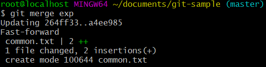 우선, master브랜치에서 common.txt라는 파일을 만들고, exp브랜치에 merge한다.