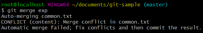 다시 master로 돌아와서 git merge exp 명령어를 실행하면 아래와 같이 충돌(conflict)이 발생한다.