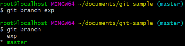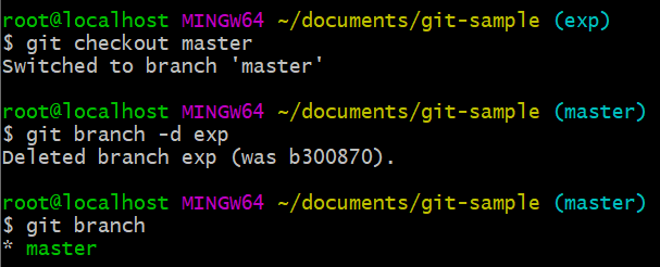 master 브랜치로 전환한 후 exp 브랜치를 삭제해보자.