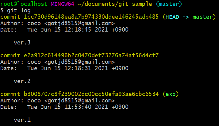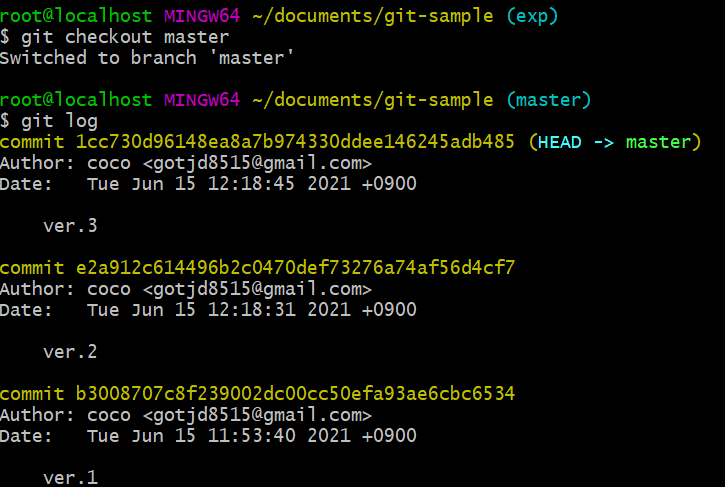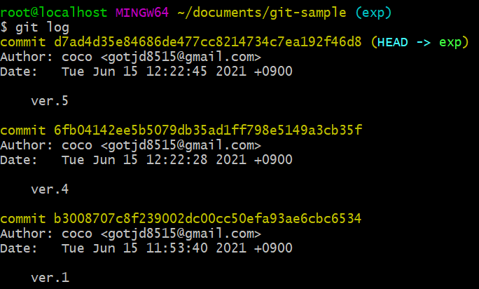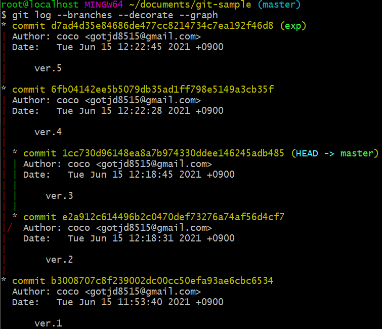 위를 보면 ver.1 ~ ver.3 까지는 master 브랜치의 히스토리이며, ver.1, ver.4, ver5는 exp 브랜치의 히스토리임을 뜻한다.