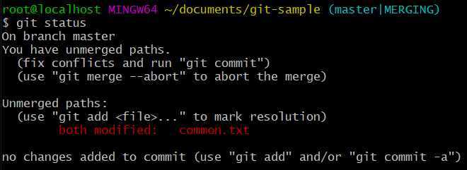 merge에 실패했다고 뜬다. common.txt 파일을 열어보면 아래와 같이 바뀌어 있는 것을 볼 수 있다.