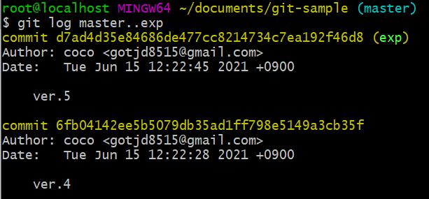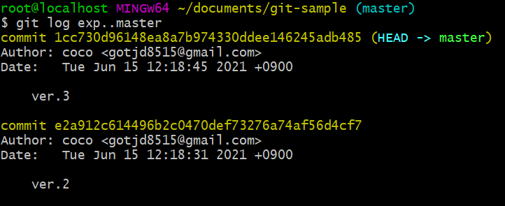 master 브랜치에 없는 commit 두 개를 보여준다. 반대로 exp..master를 입력해보자.