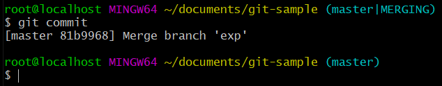 병합은 master 브랜치 입장에서 이루어진 것이므로, exp 브랜치에는 영향이 끼치지 않는 것이다.