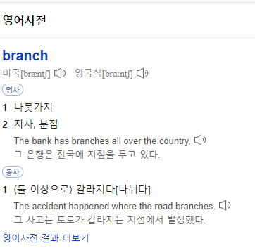 네이버 영어사전을 기준으로 branch는 나뭇가지, 지사 또는 (둘 이상으로)갈라지다라는 뜻을 가지고 있다.