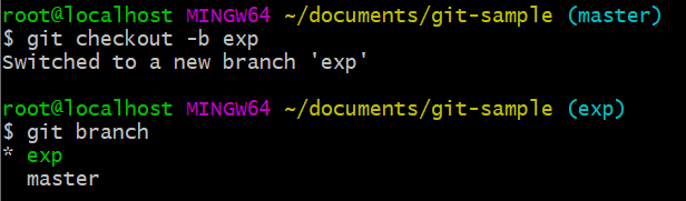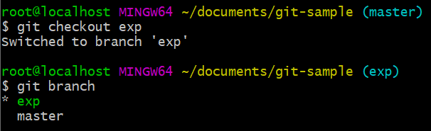 위와 같이 * 표시가 master에서 exp로 변경된걸 볼 수 있다.