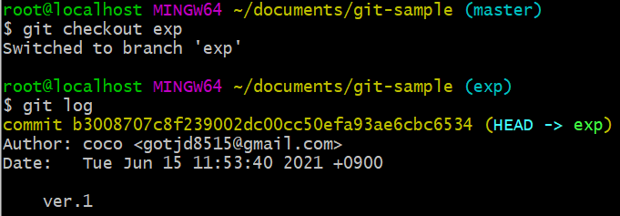 이제 master 브랜치에서 exp 브랜치로 전환해보자.