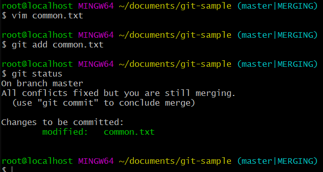 여기서 git commit 명령어를 입력하면 아래와 같이 충돌(conflict)이 났던 것을 수정했고, merge를 했다는 것을 볼 수 있다.