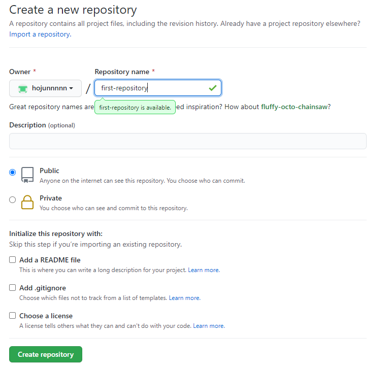 - public / private : 원격 저장소 공개여부 (Public : 공개저장소, Private : 개인저장소)