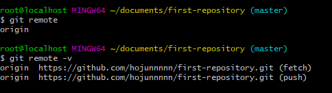 잘 연동되어 있는지는 git remote 명령어를 통해 알 수 있으며, 좀 더 자세한 정보를 원한다면 git remote -v 명령어를 통해 확인할 수 있다.