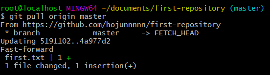 pull 명령어는 원격 저장소에서 fetch 명령어로 가져온 후 merge까지 한번에 해 실제 파일의 내용이 변경되는 명령어이다.
