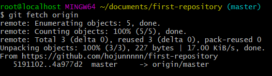 이제 fetch 명령어를 통해 변경된 내용을 가져와 보도록 한다. 명령어는 git fetch <remote> 이다.