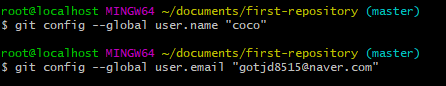 이런 인증에 대한 부분을 git config 명령어로 설정할 수 있다. 아래의 명령어는 PC의 git 시스템 환경설정정보를 설정하는 명령어이다. user.name은 시스템의 이름을, user.email은 email을 나타낸다. 이 정보들은 commit 할 때마다 이 정보를 사용한다.