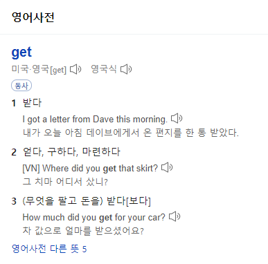 네이버에 get이라는 단어를 검색해보면 위와 같이 받다, 얻다, 구하다라는 뜻을 가진 단어인데,
