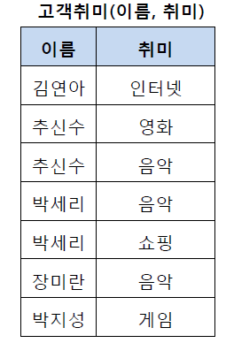위의 테이블에서 추신수와 박세리는 여러 개의 취미를 가지고 있기 때문에 제1 정규형을 만족하지 못하고 있습니다.