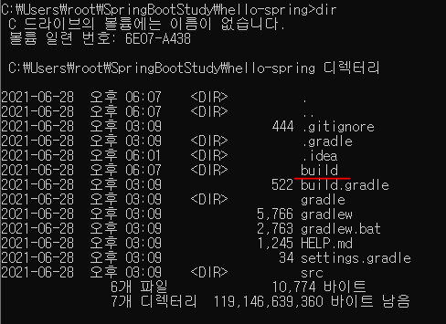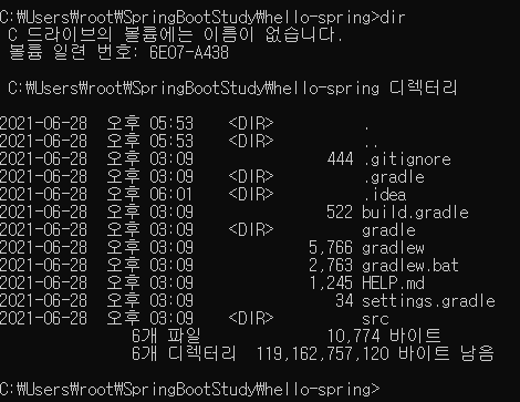 그 후 dir 를 입력해 보면 gradlew.bat 이라는 bat파일이 있는걸 확인할 수 있습니다.