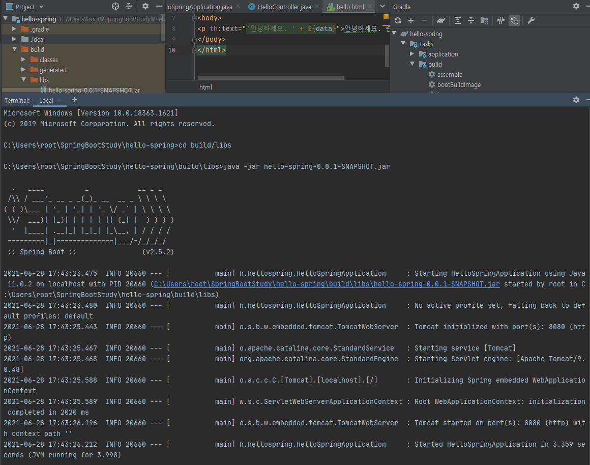 build 폴더 안에 libs 폴더로 이동해 줍니다. 그리고 해당 디렉토리에서 java -jar [ jar name ].jar 를 실행하면 성공입니다.