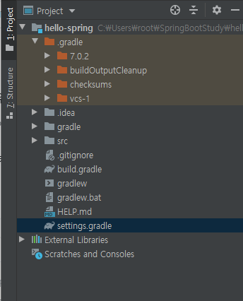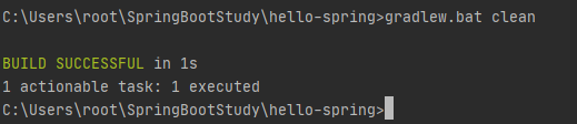 삭제하는 방법은 아래와 같습니다. hello-spring 프로젝트 폴더에 gradlew.bat clean 명령어를 사용합니다.