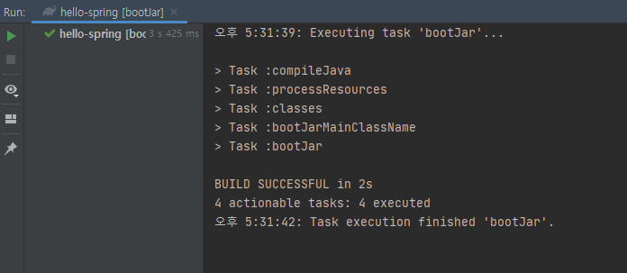 우측의 Gradle 탭에서 Tasks > build 안에 실행 가능한 bootJar 스크립트를 더블클릭하면 됩니다.
