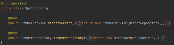 그리고 특정 타입을 리턴하는 메소드를 만들고, @Bean 어노테이션을 붙여주면 자동으로 해당 타입의 빈 객체가 생성됩니다.