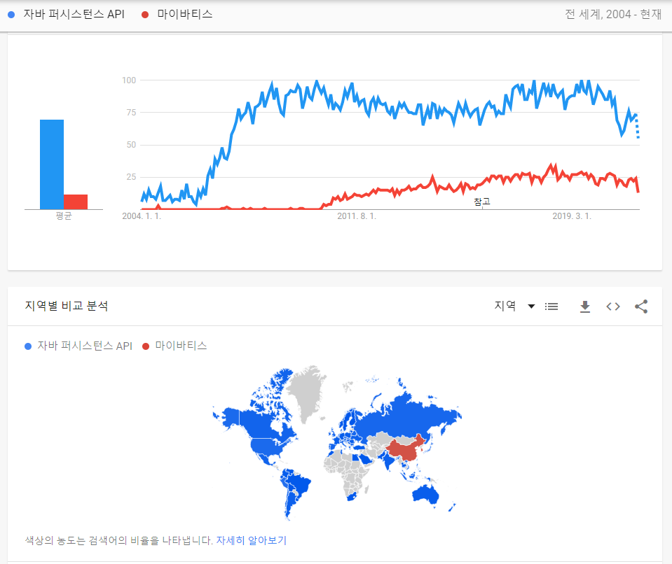 아래 그림은 구글 트렌드를 이용한 JPA와 마이바티스 중 어떤 것을 더 많이 사용하는지 나타낸 표입니다.